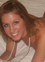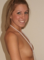 Sexy blonde teen Becky shows off her perfect perky tits as she teases on the bed topless in just black lace panties and a pearl necklace